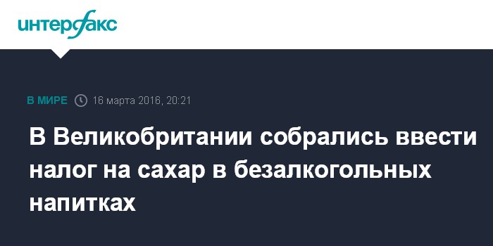 Москва. 16 марта. INTERFAX.RU - Правительство Великобритании планирует ввести налог на сахар, содержащийся в безалкогольных напитках, заявил министр финансов Джордж Осборн на заседании правительства по бюджету.