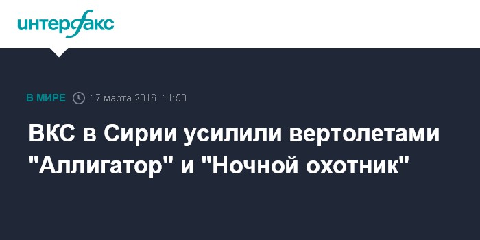 Москва. 17 марта. INTERFAX.RU - В связи с выводом основной части группировки ВКС России из Сирии задачи по огневой поддержке сирийской армии в борьбе с террористами, вероятно, будут возложены на новые российские боевые вертолеты Ка-52 "Аллигатор" и Ми-28 "Ночной охотник".
