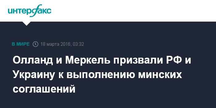 Москва. 18 марта. INTERFAX.RU - Президент Франции Франсуа Олланд сообщил, что вместе с канцлером ФРГ Ангелой Меркель в ходе встречи в четверг в Брюсселе с президентом Украины Петром Порошенко он призвал как украинскую, так и российскую сторону выполнять этапы, предусмотренные минскими соглашениями.