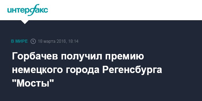 Москва. 18 марта. INTERFAX.RU - Экс-президент СССР Михаил Горбачев стал лауреатом премии немецкого города Регенсбурга "Мосты".