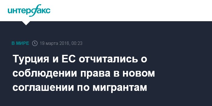 Москва. 19 марта. INTERFAX.RU - ЕС и Турция договорились об условиях возвращения в Турцию мигрантов, нелегально переправившихся из этой страны на греческие острова в Эгейском море, в соответствии с нормами международного права, которое запрещает коллективный подход к просителям убежища.