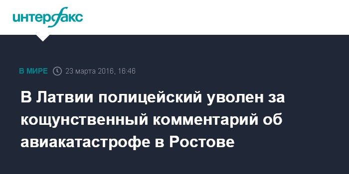 Москва. 23 марта. INTERFAX.RU - Сотрудник полиции самоуправления Риги, который после авиакатастрофы в Ростове-на-Дону опубликовал в фейсбуке неподобающий комментарий, был уволен со службы, сообщили агентству ЛЕТА в полиции.