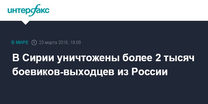 Москва. 23 марта. INTERFAX.RU - 17 полевых командиров-выходцев из России ликвидированы на территории Сирии, сообщил командующий российской группировкой генерал-полковник Александр Дворников.