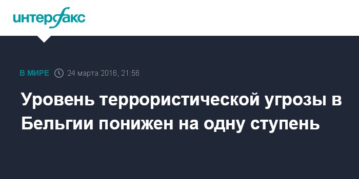 Москва. 24 марта. INTERFAX.RU - Бельгийское учреждение по координации анализа угроз приняло в четверг вечером решение понизить уровень террористической угрозы в Бельгии до отметки "3" - предпоследней по четырехбалльной шкале, объявил бельгийский министр внутренних дел Ян Ямбон.