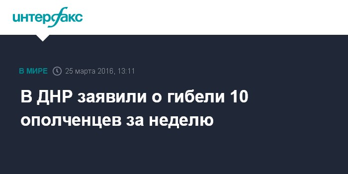 Москва. 25 марта. INTERFAX.RU - Потери самопровозглашенной Донецкой народной республики в ходе боевых действий в Донбассе за минувшую неделю составили 10 человек убитыми, сообщила журналистам в пятницу уполномоченный по правам человека в ДНР Дарья Морозова