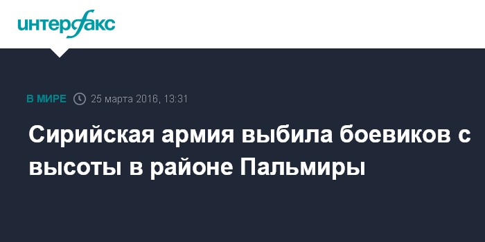 Москва. 25 марта. INTERFAX.RU - Армия Сирии вернула под свой контроль холм Сириатель у Пальмиры в ходе операции по освобождению города от боевиков запрещенной в РФ группировки "Исламское государство", сообщает в пятницу сирийское агентство SANA.