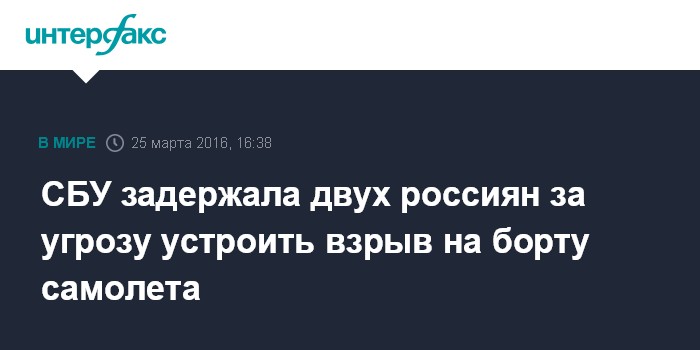 Москва. 25 марта. INTERFAX.RU - Служба безопасности Украины задержала двух граждан РФ в связи с сообщением о взрывоопасном предмете на борту самолета, летевшего из Дубая (ОАЭ) в Киев.