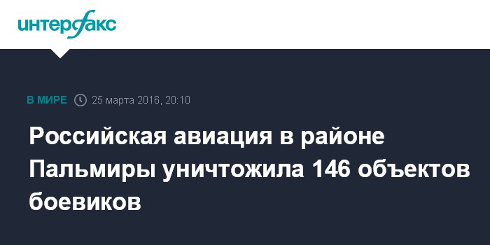 Москва. 25 марта. INTERFAX.RU - За последние несколько дней в результате российских авиаударов в районе Пальмиры 146 объектов боевиков, включая артиллерию и танки, уничтожены, сообщил в пятницу журналистам начальник российского центра по примирению враждующих сторон на территории Сирии генерал-лейтенант Сергей Кураленко.