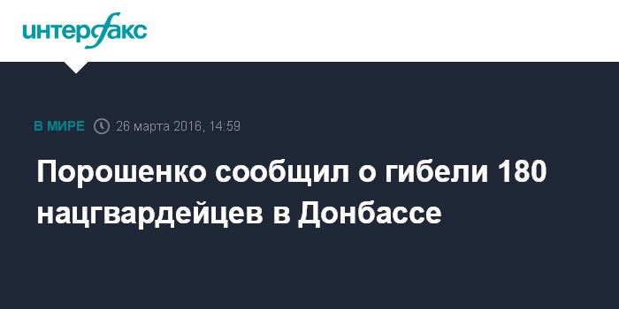 Москва. 26 марта. INTERFAX.RU - Президент Украины Петр Порошенко сообщил, что 180 военнослужащих Национальной гвардии Украины погибли на юго-востоке страны во время военной операции.