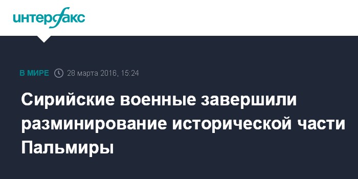 Москва. 28 марта. INTERFAX.RU - Сирийские саперы завершили в понедельник разминирование археологического комплекса в Пальмире, сообщил агентству EFE губернатор провинции Хомс Таляль аль-Барази.