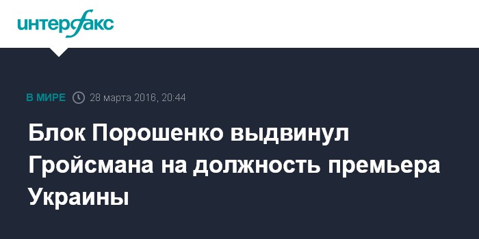 Москва. 28 марта. INTERFAX.RU - Фракция "Блок Петра Порошенко" на заседании в понедельник поддержала кандидатуру председателя Верховной рады Владимира Гройсмана на должность премьер-министра.