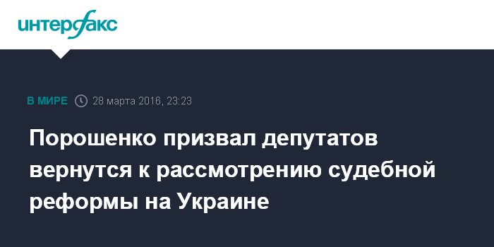 Москва. 28 марта. INTERFAX.RU - Президент Украины Петр Порошенко подчеркивает необходимость продолжения судебной реформы и рассмотрения изменений в Конституцию страны в части правосудия, сообщает пресс-служба главы государства в понедельник.