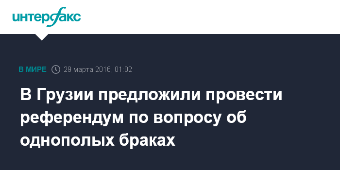 Москва. 29 марта. INTERFAX.RU - Центральная избирательная комиссия (ЦИК) Грузии на заседании в понедельник зарегистрировала вопрос о проведении референдума по поводу однополых браков.