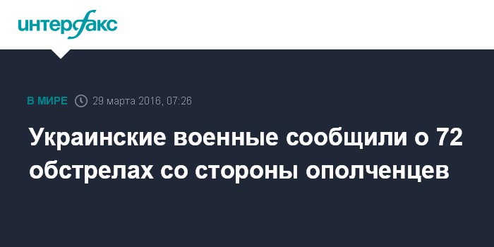 Москва. 29 марта. INTERFAX.RU - За прошедшие сутки ополченцы 72 раза обстреляли позиции украинских военных в Донбассе, сообщает пресс-центр военной операции на своей странице в Facebook во вторник утром.