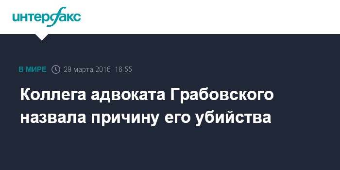 Москва. 29 марта. INTERFAX.RU - Убийство адвоката Юрия Грабовского связано с тем, что он защищал в украинском суде россиянина Александра Александрова, заявила адвокат другого второго фигуранта этого дела Оксана Соколовская после просмотра обнародованных видео из материалов следствия.