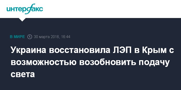Москва. 30 марта. INTERFAX.RU - Украина в случае достижения договоренностей может в течение нескольких часов возобновить подачу электроэнергии в Крым по трем восстановленным линиям электропередачи напряжением 330 кВ, сообщил и.о. главы НЭК "Укрэнерго" Всеволод Ковальчук.