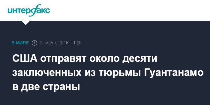 Москва. 31 марта. INTERFAX.RU - Пентагон намерен отправить около десятка заключенных из американской военной тюрьмы, расположенной на базе в Гуантанамо, как минимум в две страны, передает в четверг британская "Би-би-си".