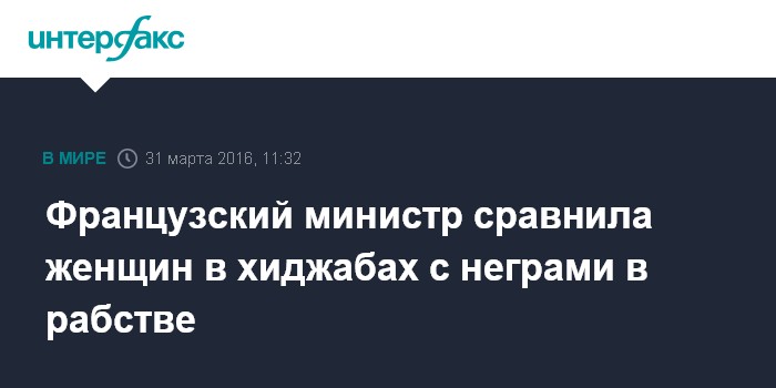 Москва. 31 марта. INTERFAX.RU - Министр по правам женщин Франции Лоранс Россиньол сравнила мусульманок в хиджабах с "американскими неграми".
