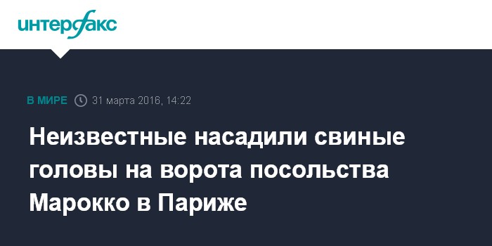 Москва. 31 марта. INTERFAX.RU - Две отрубленные свиные головы были обнаружены в четверг при входе в посольство Марокко в Париже, сообщает радиостанция France Info.