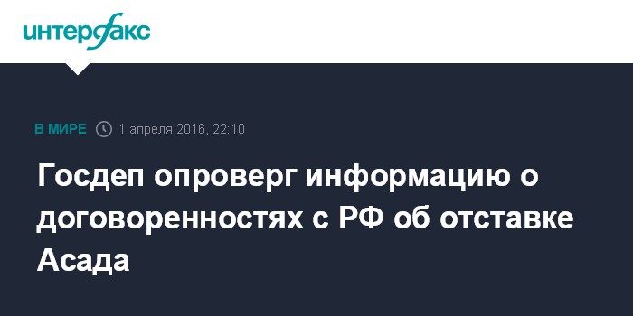 Москва. 1 апреля. INTERFAX.RU - Сведения о том, что США и Россия договорились о будущей отставке президента Сирии Башара Асада и о его переезде из Сирии, не соответствуют действительности, сообщила в пятницу на брифинге представитель госдепа Элизабет Трюдо.