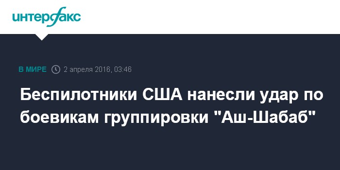 Москва. 2 апреля. INTERFAX.RU - Военные США организовали авиаудар с помощью дронов в Сомали. Как пишет The Washington Post со ссылкой на пятничный отчет представителей Пентагона, главной целью атаки был один из лидеров группировки - Хассан Али Дхор, который курировал атаки, в которых погибли, по меньшей мере, три гражданина США. Авиаудар, как уточняют в Вашингтоне, был произведен в четверг, 31 марта.