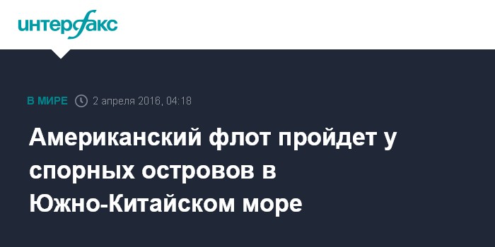 Москва. 2 апреля. INTERFAX.RU - ВМС США планируют провести еще один проход вблизи спорных островов в Южно-Китайском море в начале апреля. Как передает Daily Mail со ссылкой на источник, знакомый с планами, это будет третье подобное мероприятие, ранее неоднократно вызывавшее протесты со стороны Китая.