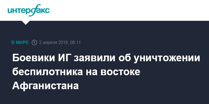 Москва. 2 апреля. INTERFAX.RU - Боевики террористической группировки Исламское государство (ИГ, запрещена в РФ) утверждают, что сбили беспилотник в восточной афганской провинции Нангархар. В подтверждение своих заявлений боевики опубликовали фотографию сбитого беспилотного летательного аппарата.