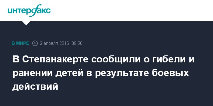 Москва. 2 апреля. INTERFAX.RU - Один ребенок погиб и двое ранены в результате ракетных обстрелов мирных населенных пунктов Нагорного Карабаха, заявили в пресс-службе Минобороны непризнанной Нагорно-Карабахской республики (НКР).