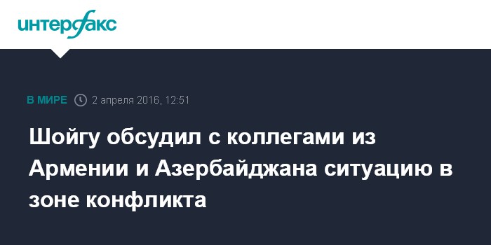 Москва. 2 апреля. INTERFAX.RU - Министр обороны России генерал армии Сергей Шойгу в субботу провел экстренные телефонные переговоры с министрами обороны Армении Сейраном Оганяном и Азербайджана Закиром Гасановым в связи с обострением карабахского конфликта.