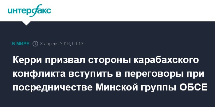 Москва. 3 апреля. INTERFAX.RU - Государственный секретарь США Джон Керри призвал стороны карабахского конфликта придерживаться соглашения о прекращении огня и сесть за стол переговоров.