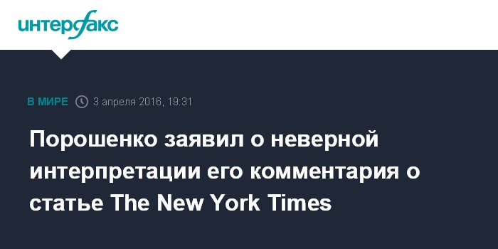 "Мне жаль, что мои слова о публикации в респектабельной The New York Times были неверно интерпретированы. Сам читаю это издание и уважаю позицию его редакционного совета", - написал Порошенко в своей официальной странице в фейсбуке в воскресенье вечером на украинском и английском языках.