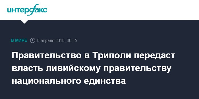 Москва. 5 апреля. INTERFAX.RU - Базирующееся в Триполи самопровозглашенное правительство Ливии объявило во вторник о согласии передать власть правительству национального единства, сообщают западные СМИ.