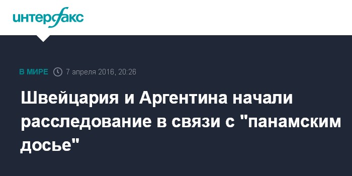 Москва. 7 апреля. INTERFAX.RU - Прокуратуры Швейцарии и Аргентины начали расследование по фактам, изложенным в опубликованном недавно "панамском досье", сообщает "Би-би-си".