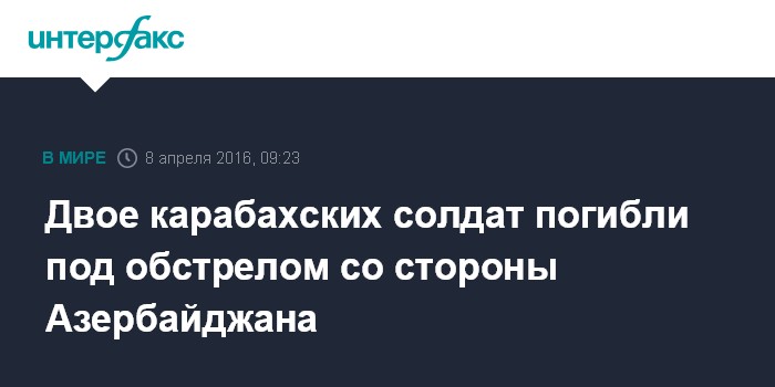 Москва. 8 апреля. INTERFAX.RU - Два военнослужащих армии обороны непризнанной Нагорно-Карабахской республики погибли при обстрелах со стороны вооруженных сил Азербайджана в ночь на пятницу, сообщает пресс-служба Минобороны НКР.