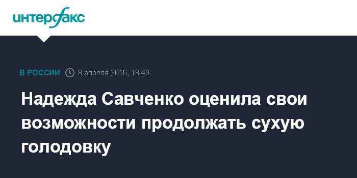 Москва. 8 апреля. INTERFAX.RU - Осужденная российским судом украинская военнослужащая и депутат Надежда Савченко, находящаяся в СИЗО на территории РФ, считает, что на сухой голодовке сможет продержаться еще минимум 4 дня, сообщает адвокат Илья Новиков.