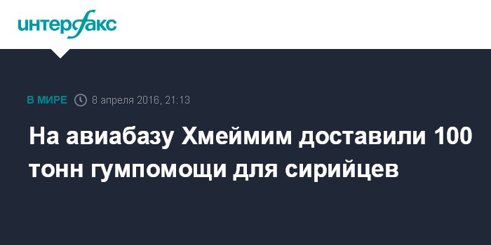Москва. 8 апреля. INTERFAX.RU - На базу российских Воздушно - космических сил (ВКС) в Сирии доставлено 100 тонн гуманитарной помощи для жителей сирийских провинций, сообщил официальный представитель Министерства обороны РФ генерал-майор Игорь Конашенков.