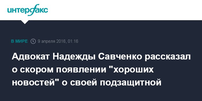 Москва. 9 апреля. INTERFAX.RU - Адвокат Илья Новиков в ближайшие дни ожидает хороших новостей о судьбе своей подзащитной украинской летчицы Надежды Савченко, которая приговорена судом в России к 22 годам заключения.
