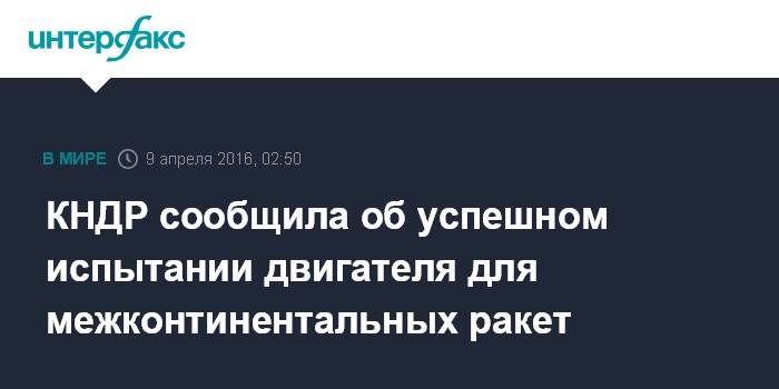 Москва. 9 апреля. INTERFAX.RU - Власти Северной Кореи отчитались об успешно проведенных испытаниях двигателя для межконтинентальных баллистических ракет, сообщило Центральное телеграфное агентство Кореи.