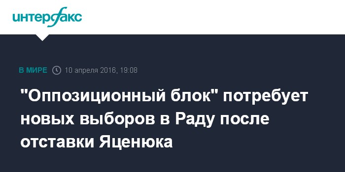 Москва. 10 апреля. INTERFAX.RU - Фракция партии "Оппозиционный блок" требует после отставки премьер-министра Украины Арсения Яценюка объявления досрочных парламентских выборов.