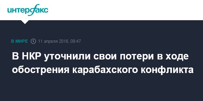 Москва. 11 апреля. INTERFAX.RU - По данным на утро понедельника, число погибших в результате обострившегося со 2 по 5 апреля конфликта с Азербайджаном военнослужащих Армии обороны непризнанной Нагорно-Карабахской Республики (НКР) составило 56 человек, сообщил "Интерфаксу" пресс-секретарь Минобороны НКР Сенор Асратян.