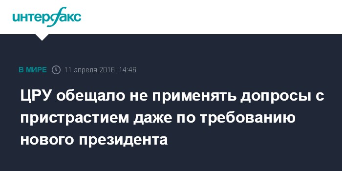 Москва. 11 апреля. INTERFAX.RU - Директор ЦРУ Джон Бреннан пообещал, что его сотрудники не станут использовать технику "допросов с пристрастием" в отношении подозреваемых, даже если этого потребует новый президент страны.