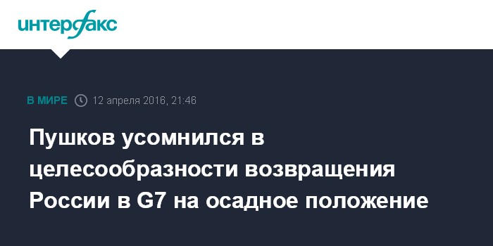 Москва. 12 апреля. INTERFAX.RU - Глава комитета Госдумы по международным делам Алексей Пушков считает, что "Большая семерка" в ее сегодняшнем виде не нужна России; организация должна быть реформирована, а в ее состав необходимо ввести Китай.