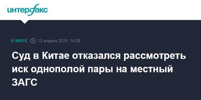 Москва. 13 апреля. INTERFAX.RU - Суд в китайском городе Чанша отклонил иск однополой пары на местный ЗАГС, отказавшийся зарегистрировать их брак, сообщило из КНР информагентство AP.