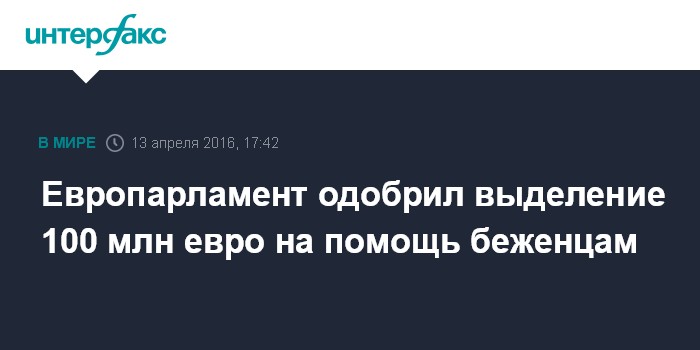 Москва. 13 апреля. INTERFAX.RU - Депутаты Европарламента, голосуя по первым поправкам к бюджету 2016 года, дали "зеленый свет" оказанию чрезвычайной помощи в размере 100 млн евро беженцам, находящимся на территории ЕС.