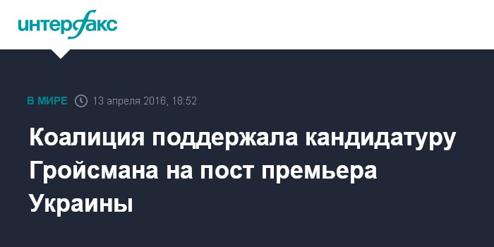 Москва. 13 апреля. INTERFAX.RU - Украинская парламентская коалиция на собрании в среду поддержала кандидатуру нынешнего председателя Верховной Рады Владимира Гройсмана на должность главы правительства, сообщил пресс-секретарь Гройсмана Дмитрий Столярчук.
