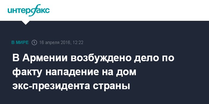 Москва. 16 апреля. INTERFAX.RU - Следственный комитет Армении возбудил уголовное дело по факту нападения на дом бывшего президента республики Роберта Кочаряна, сообщили в субботу в пресс-службе ведомства.