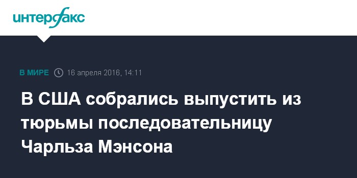 Москва. 16 апреля. INTERFAX.RU - Калифорнийская комиссия по условно-досрочному освобождению рекомендовала освободить Лесли ван Хоутен - одну из нескольких членов так называемой "семьи Мэнсона" - группы убийц, которые в 1969 году совершили серию жестоких убийств, в том числе супруги режиссера Романа Полански.