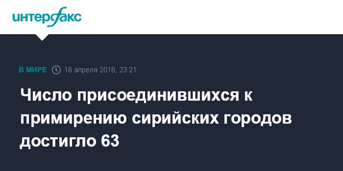 Москва. 16 апреля. INTERFAX.RU - Министерство обороны РФ заявляет, что количество населенных пунктов, присоединившихся к процессу примирения в Сирии, увеличилось до 63.