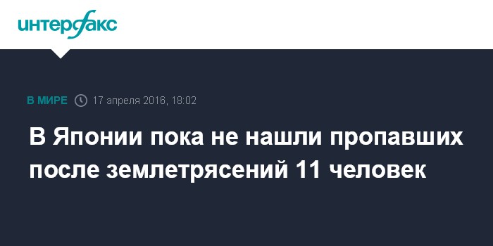 Москва. 17 апреля. INTERFAX.RU - 11 человек все еще считаются пропавшими без вести после двух землетрясений, происшедших ранее на этой неделе в Японии, передает в воскресенье агентство Associated Press.