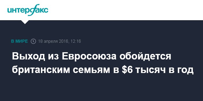 Москва. 18 апреля. INTERFAX.RU - Выход Великобритании из Европейского союза (так называемый Brexit) приведет к сокращению экономики страны на 6% к 2030 году и обойдется британским домохозяйствам в 4,3 тыс. фунтов стерлингов ($6,1 тыс.) в год, заявил министр финансов Великобритании Джордж Осборн в интервью на радио BBC4.
